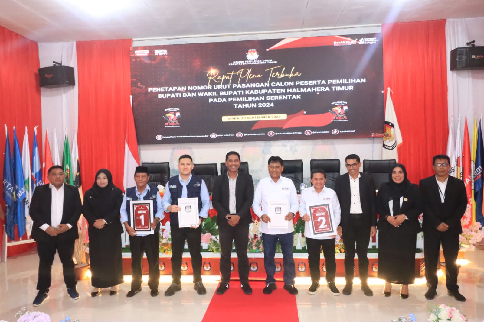 Ketua KPU Halmahera Timur Sukardi Lite mengatakan, penetapan nomor urut berdasarkan keputusan KPU nomor 606 tahun 2024 tenatang penetapan unut pasangan calon Bupati dan Wakil Bupati tahun 2024.