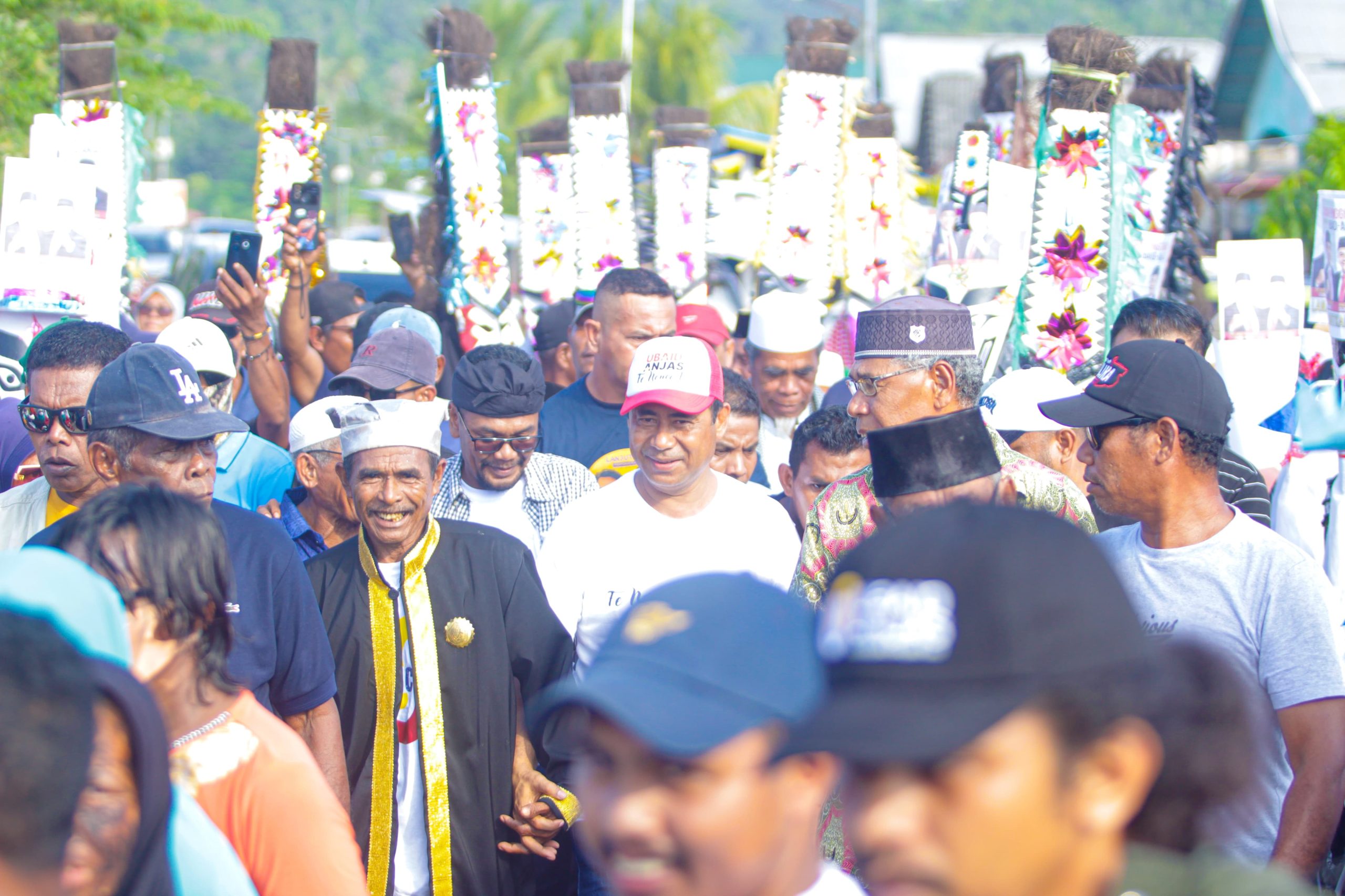 HALTIM, kapita.id – Kedatangan Calon Bupati Kabupaten Halmahera Timur (Haltim) Ubaid Yakub disambut dengan Maklumat untuk Pasangan Ubaid – Anjas.