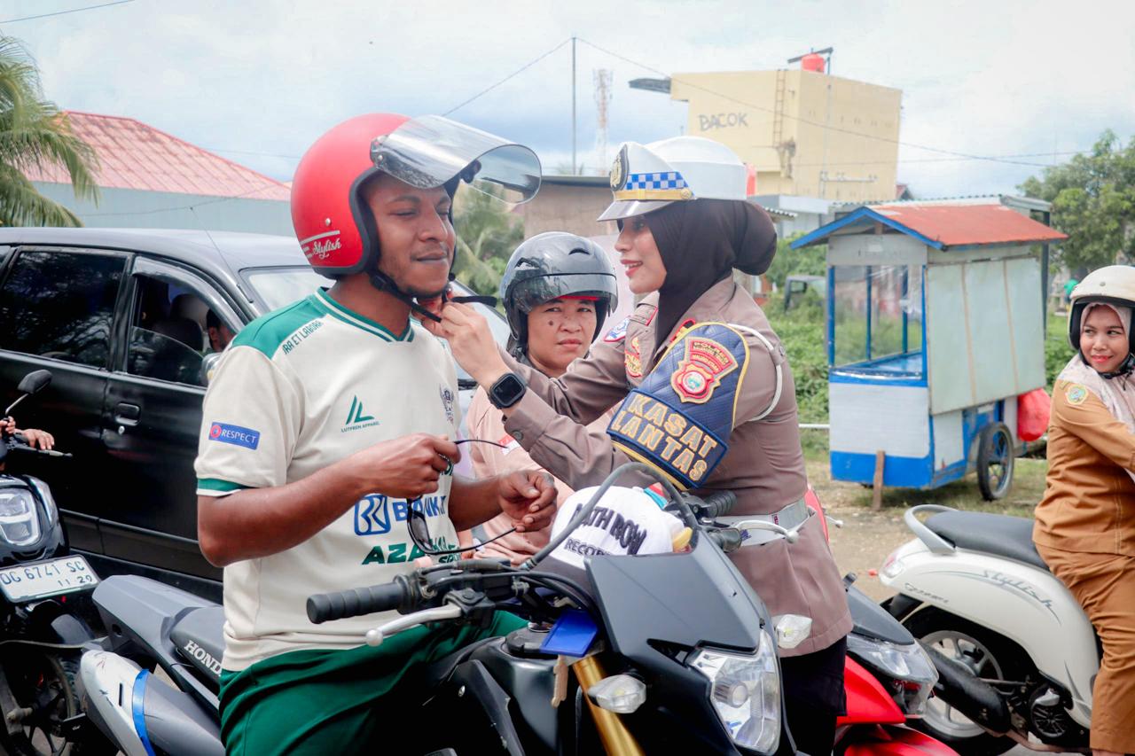 HALTENG,kapita.id – Satuan Lalu Lintas (Satlantas) Polres Halmahera Tengah (Halteng) berbagi helm gratis kepada pengguna jalan raya terutama pengendara toda dua (motor).